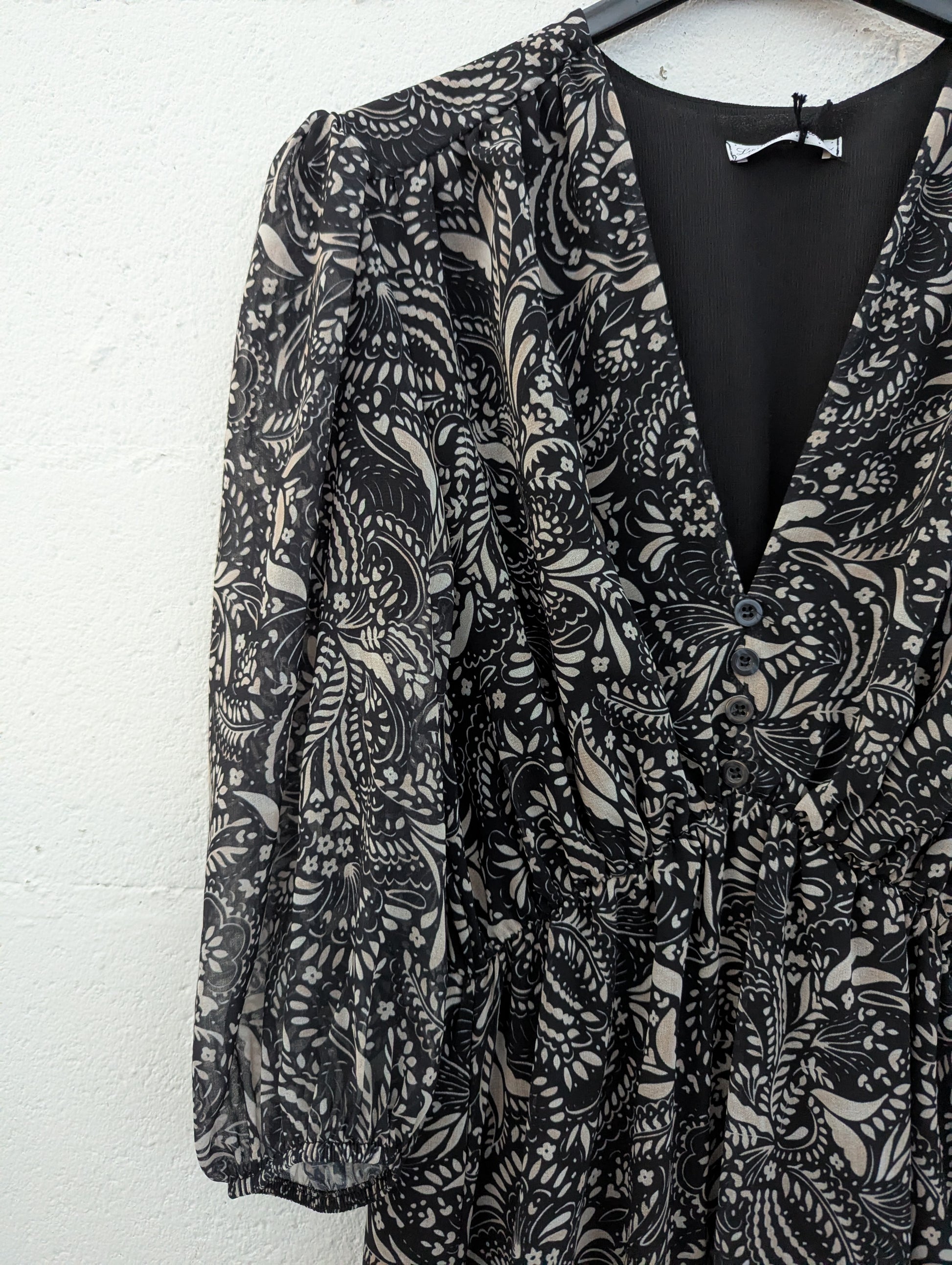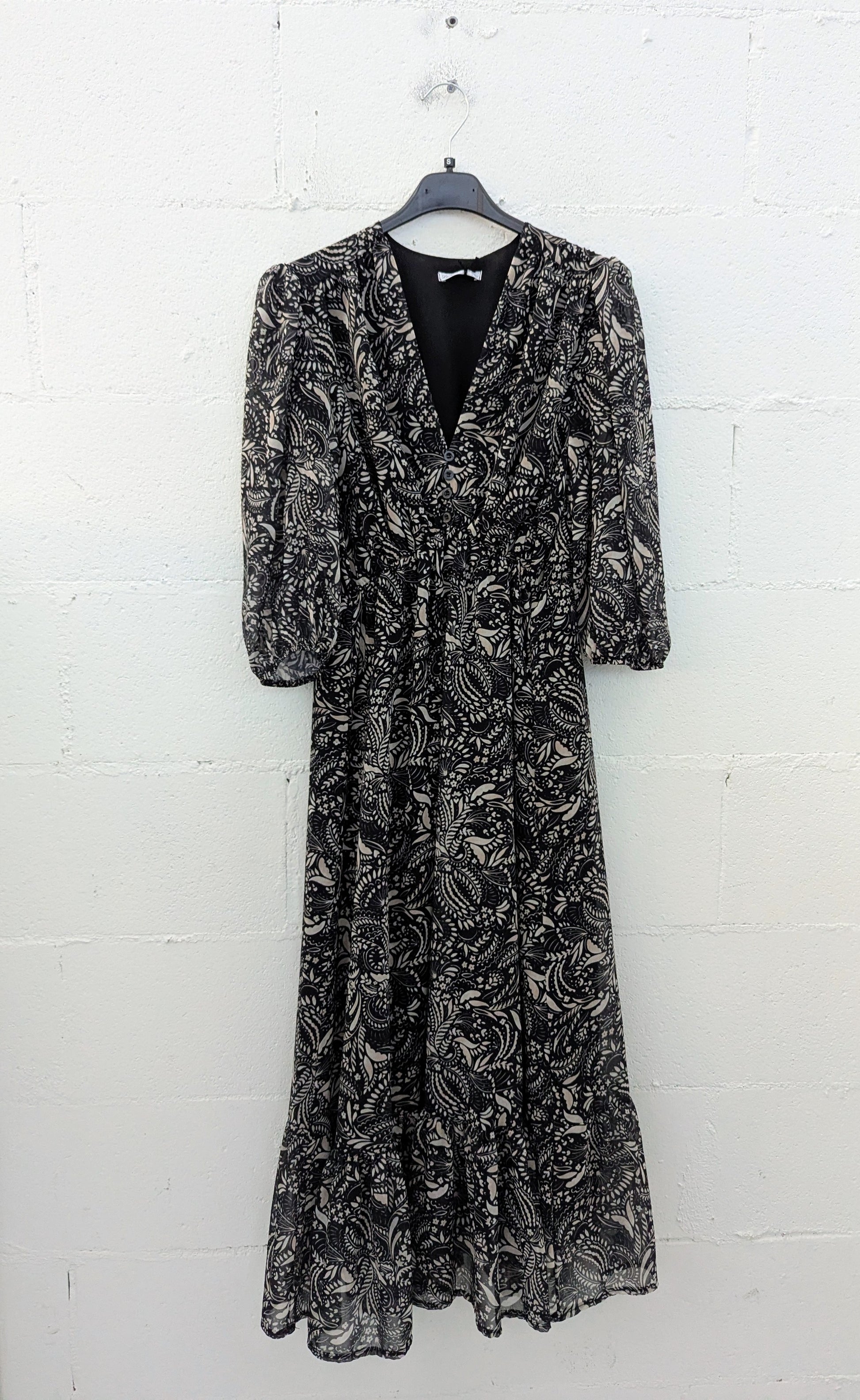 Femminile, comodo e versatile: questo abito lungo in nero con fantasia chiara ha uno scollo a V che valorizza il décolleté e una vita arricciata elastica che segna senza stringere. Le maniche 3/4 leggermente a sbuffo e la gonna fluida con balza lo rendono perfetto sia di giorno che di sera.