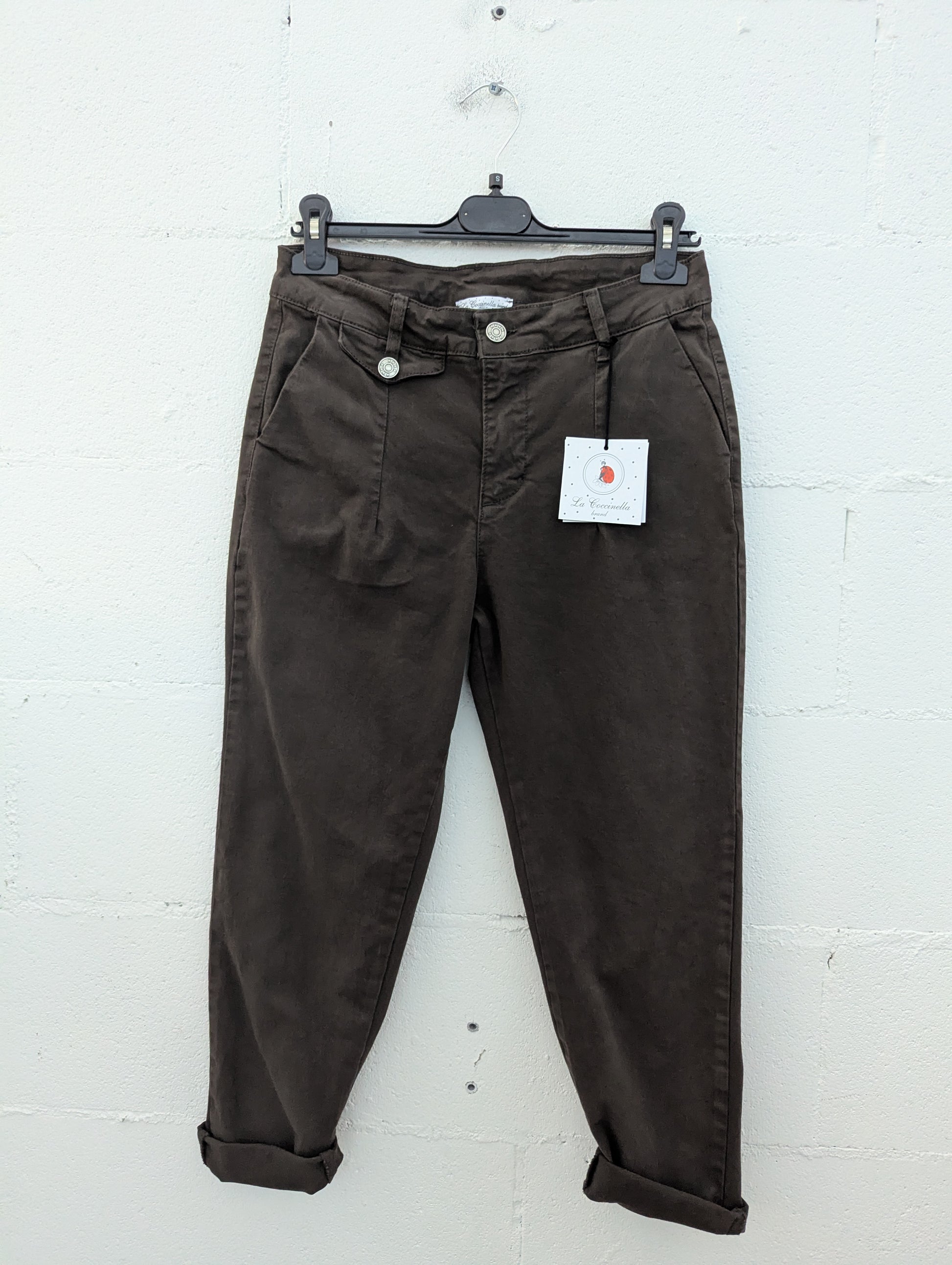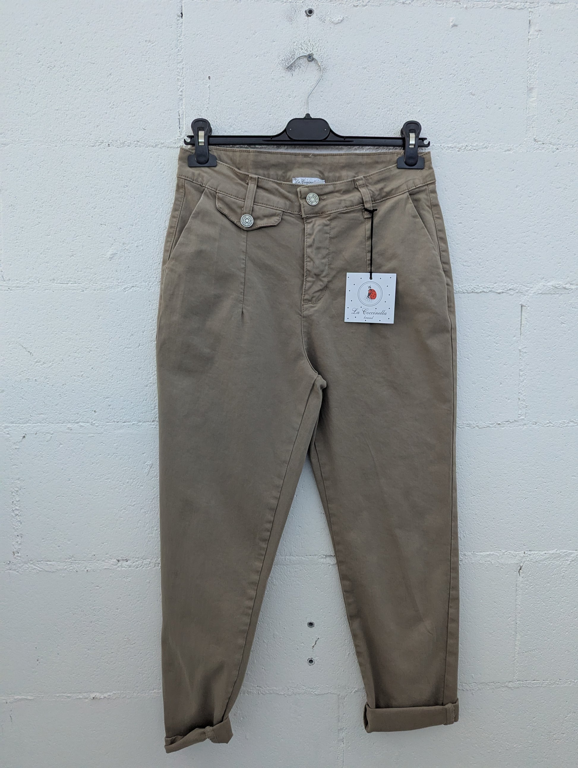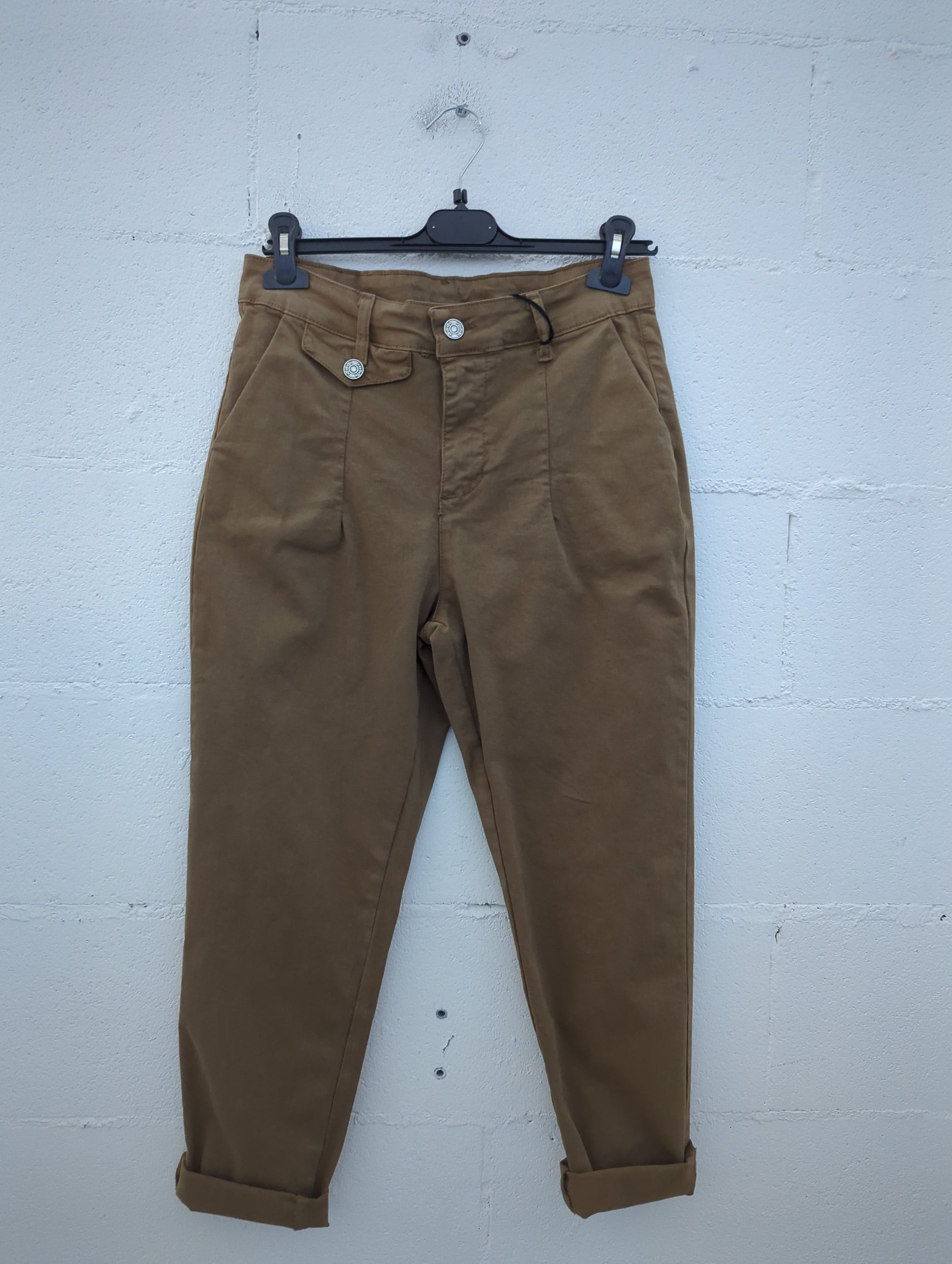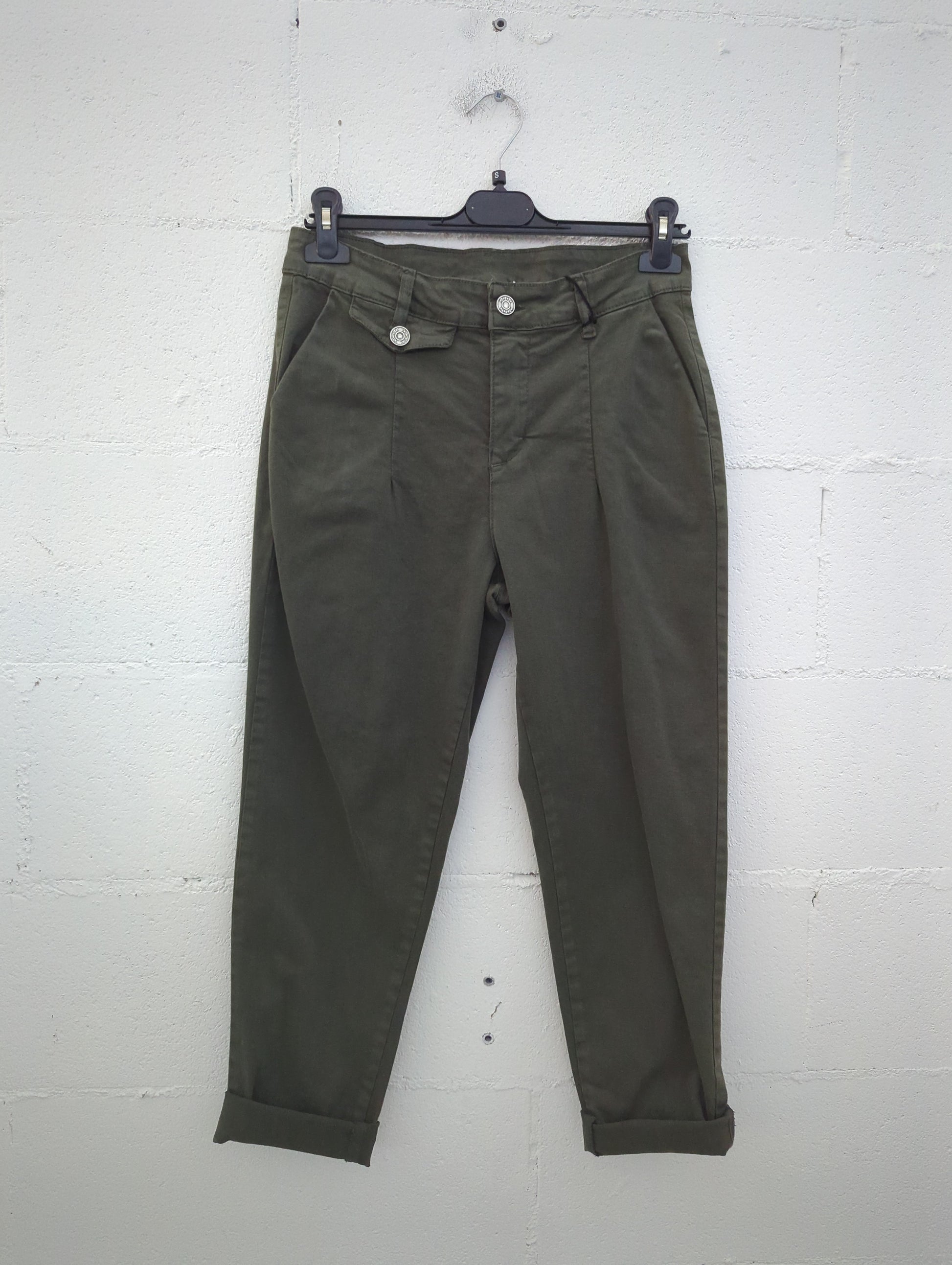 Il pantalone “furbo” che sta bene su tutto: vita alta, pinces frontali che slanciano e gamba carrot affusolata con risvolto alla caviglia. Il tessuto in cotone con una punta di elastan resta strutturato ma comodo. I bottoni gioiello in vita aggiungono un tocco chic anche ai look casual.