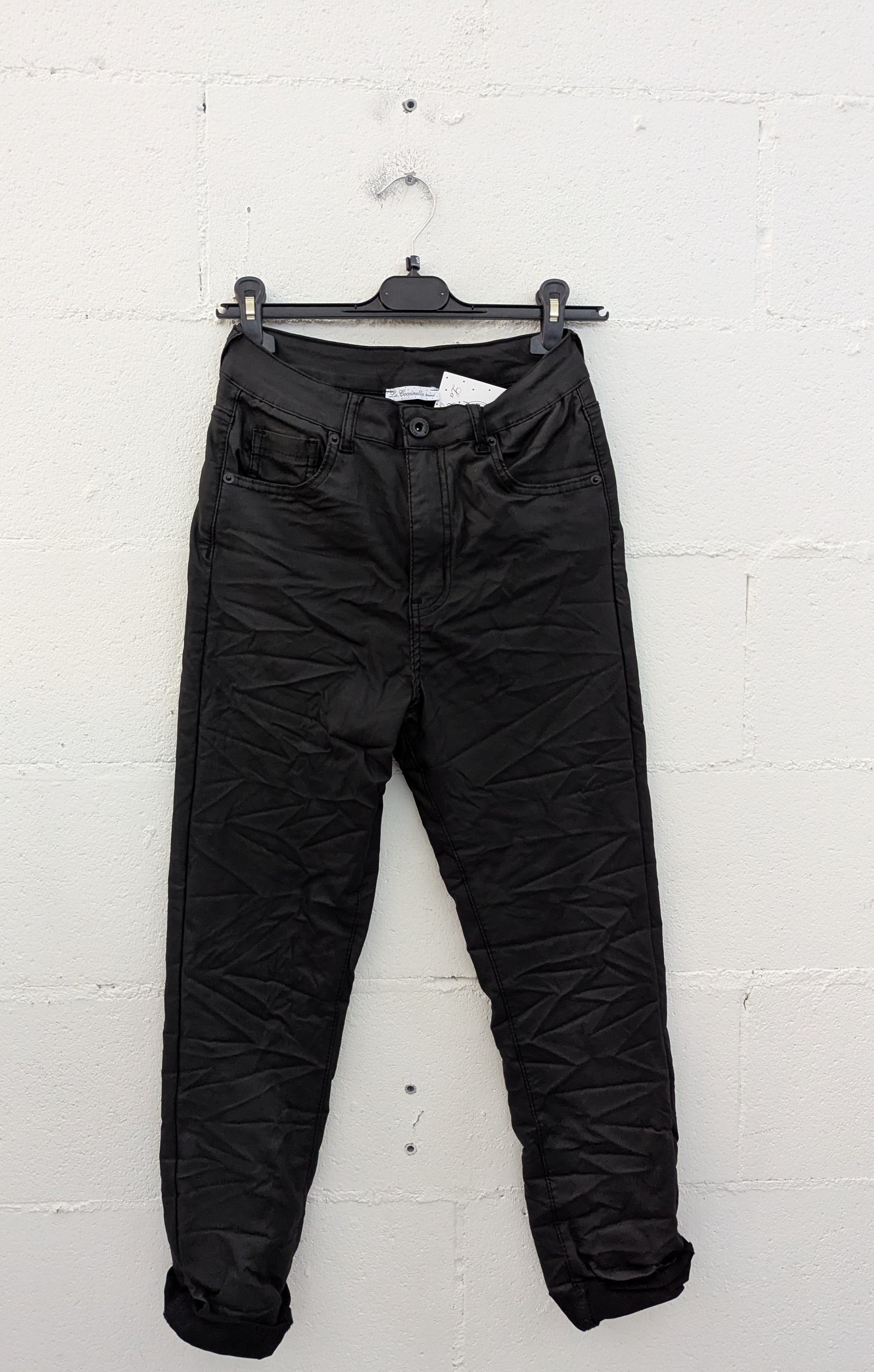 Grintosi ma portabili: i pantaloni in ecopelle nera con vita alta e linea dritta sono un must-have del guardaroba. Comodi grazie alla base in tessuto elasticizzato, hanno 5 tasche, chiusura zip + bottone e risvolto al fondo. L’effetto pelle è opaco, moderno e perfetto sia di giorno che di sera.
